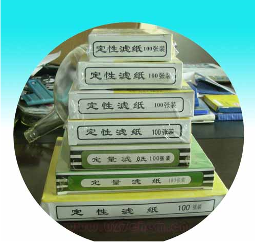 目前国内生产的定量分析滤纸,分快速、中速、慢速三类,在滤纸盒上分别用白带(快速)、蓝带(中速)、红带(慢速)为标志分类。滤纸的外形有圆形和方形两种,圆形定纸的规格按直径分有d9cm、dllcm、d12.5cm、d15cm和d18cm数种。方形定量滤纸的有60cm×60cm和30cm×30cm。